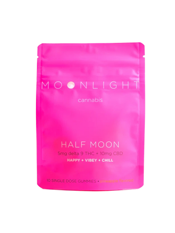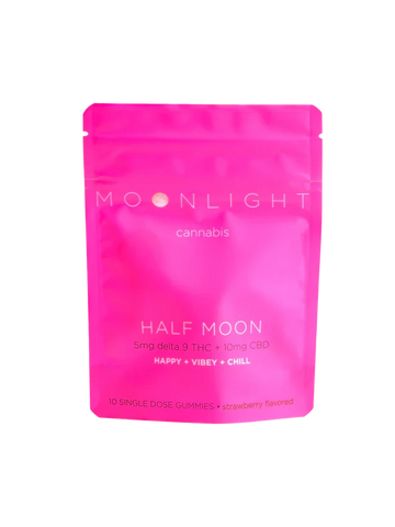 Half Moon is a line of hemp-derived edible gummies containing 5 mg of Delta 9 THC and 10 mg of CBD. Half moon will leave you with a good feeling of calmness and the ability to relax without feeling too tired or stressed. The combination of Delta 9 and CBD was designed to make you happy.