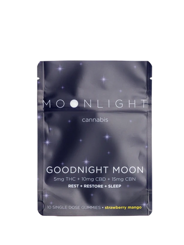 GOODNIGHT MOON is a hemp-derived gummy containing 5 mg THC + 10 mg CBD + 15 mg CBN. This gummy is designed to help you sleep. CBN (cannabinol) is one of the 100+ cannabinoids found in the cannabis plant. CBN has shown to have sedative properties that could relieve conditions like insomnia. Studies have shown that CBD also may help with sleep issues like falling or staying asleep. The unique combination of THC, CBD and CBN helps you achieve an easy, peaceful drift off into deep, comfy sleep.